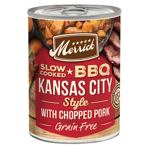 Merrick chunky grain free big texas steak tips dinner canned dog food.